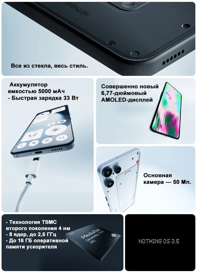 Китайская компания Nothing во многом известна благодаря невероятному дизайну своих смартфонов. Светодиодные глифы, потрясающая эргономика тонких грациозных корпусов, высококачественные материалы, продуманная до мелочей оболочка ОС с ее минимализмом оставляют положительное впечатление буквально у каждого покупателя. Однако известный разработчик не сидит сложа руки и постоянно модернизирует выпускаемые телефоны. И новый Nothing Phone (3A) Lite способен стать одной из лучших моделей в ценовом сегменте не только благодаря красивой внешности. Давайте же ознакомимся с техническими характеристиками новинки.