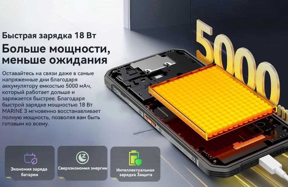 большая батарея в 5000мАч с быстрой зарядкой в 18W;